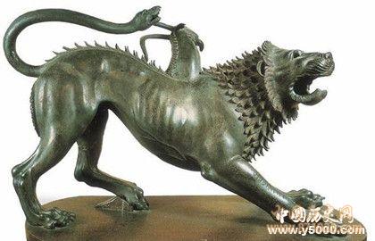 它由三部分组成,是一种会喷火的怪兽:它的前部是狮子,尾巴是一条蟒蛇,身子是山羊。它呼吸吐出的都是火焰。为了增强它凶猛的程度,人们又给了它一些新特性,说它有3个头(蟒蛇、山羊和狮子)。