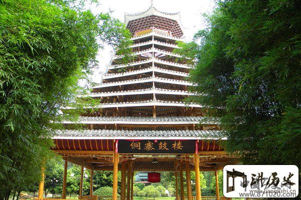 侗寨鼓楼,外形象个多面体的宝塔。一般高20多米,11层至顶,全靠16根杉木柱支撑。楼心宽阔平整,约10平方米见方,中间用石条砌有大火塘,四周有木栏杆,设有长条木凳,供歇息使用。